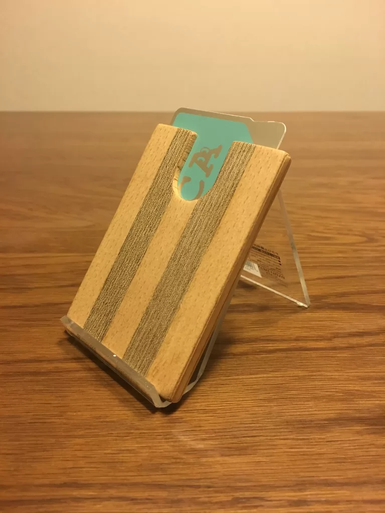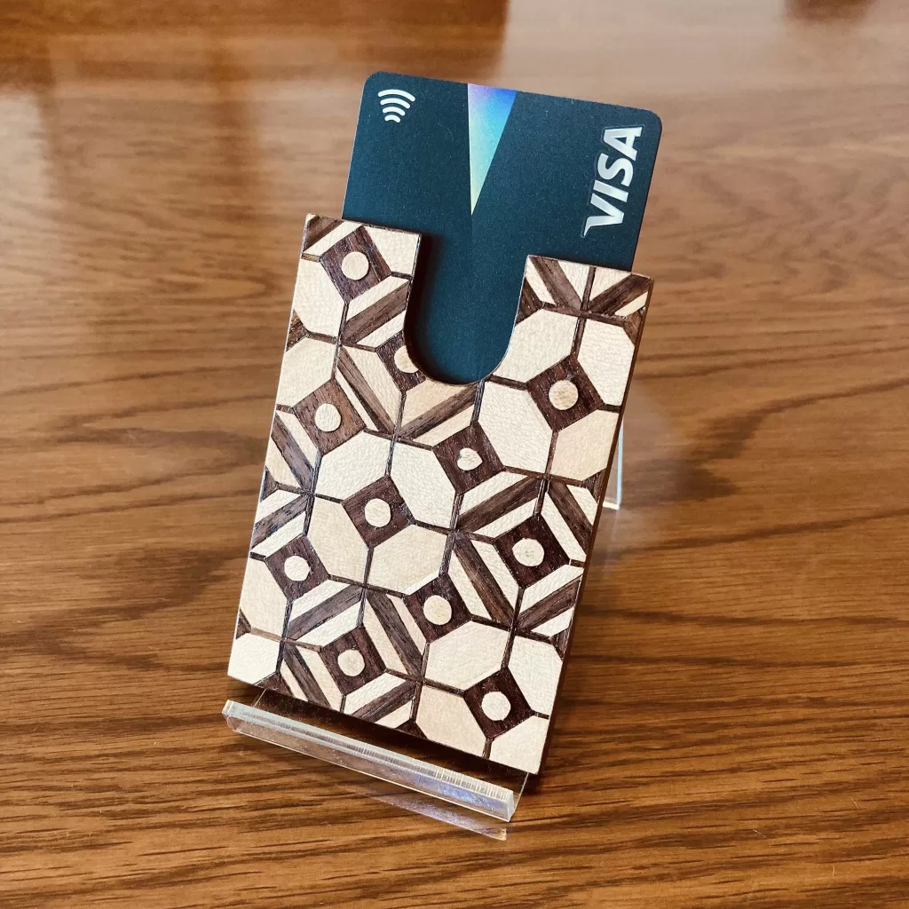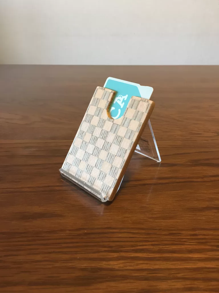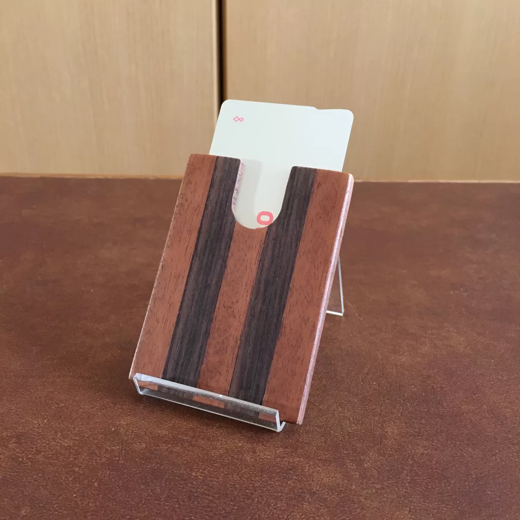 AdoMでは、木製のお財布を準備しました。現金は入りません。クレジットカード・身分証明書・交通系カードを持ち歩くことが出来ます。私個人で使用しているものはマネークリップを付属していますが、御希望に沿った機能を付属することが出来ます。現在のカード類は殆どがICチップ搭載の為、磁気でカードが使えなくなるという心配は極めて少なくなっていますので重ねて持ち歩いても大丈夫です。