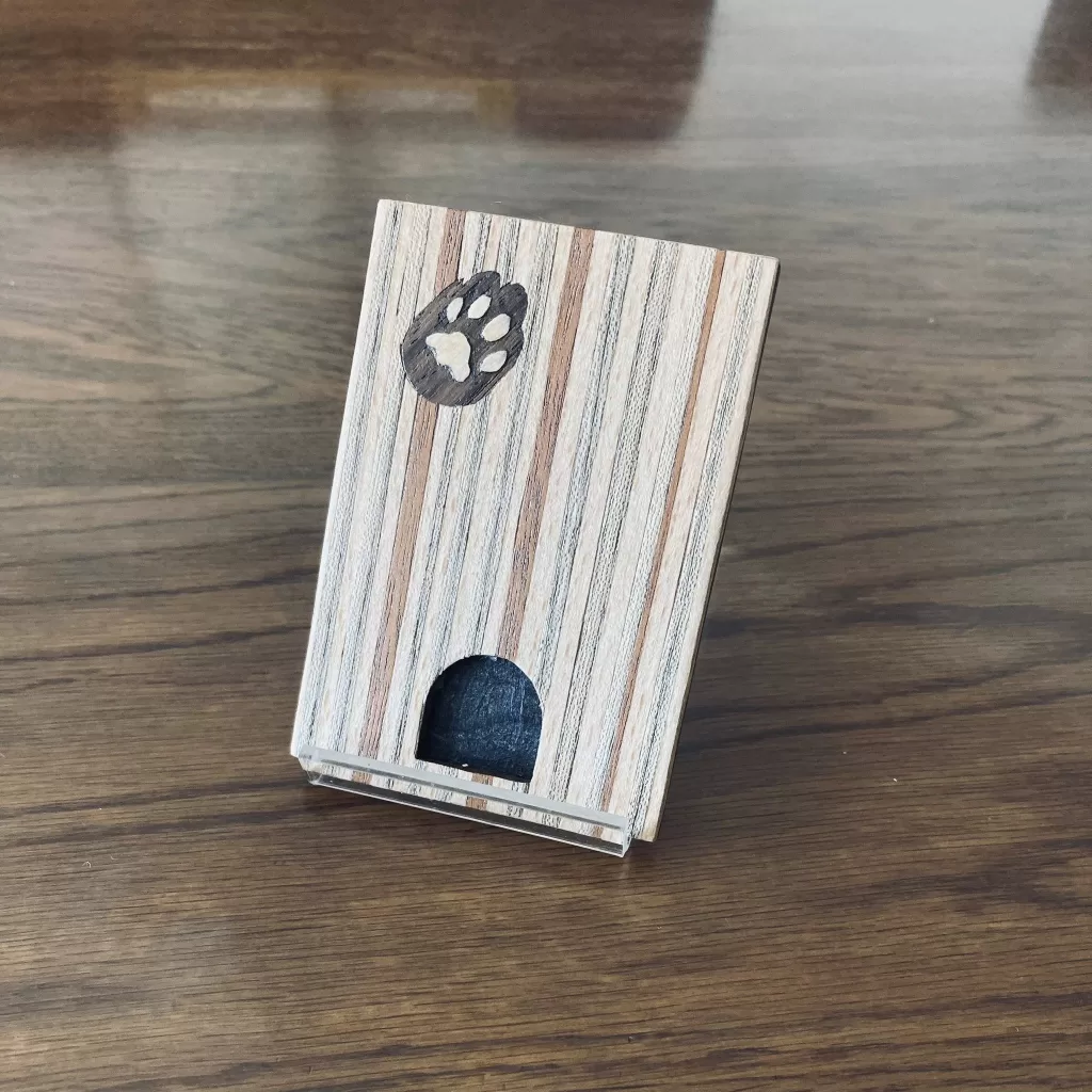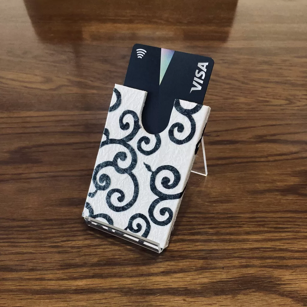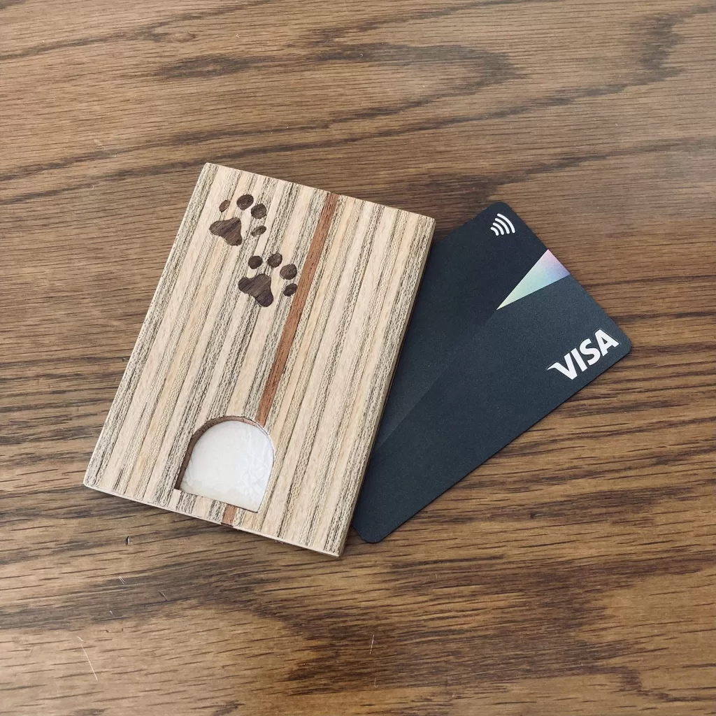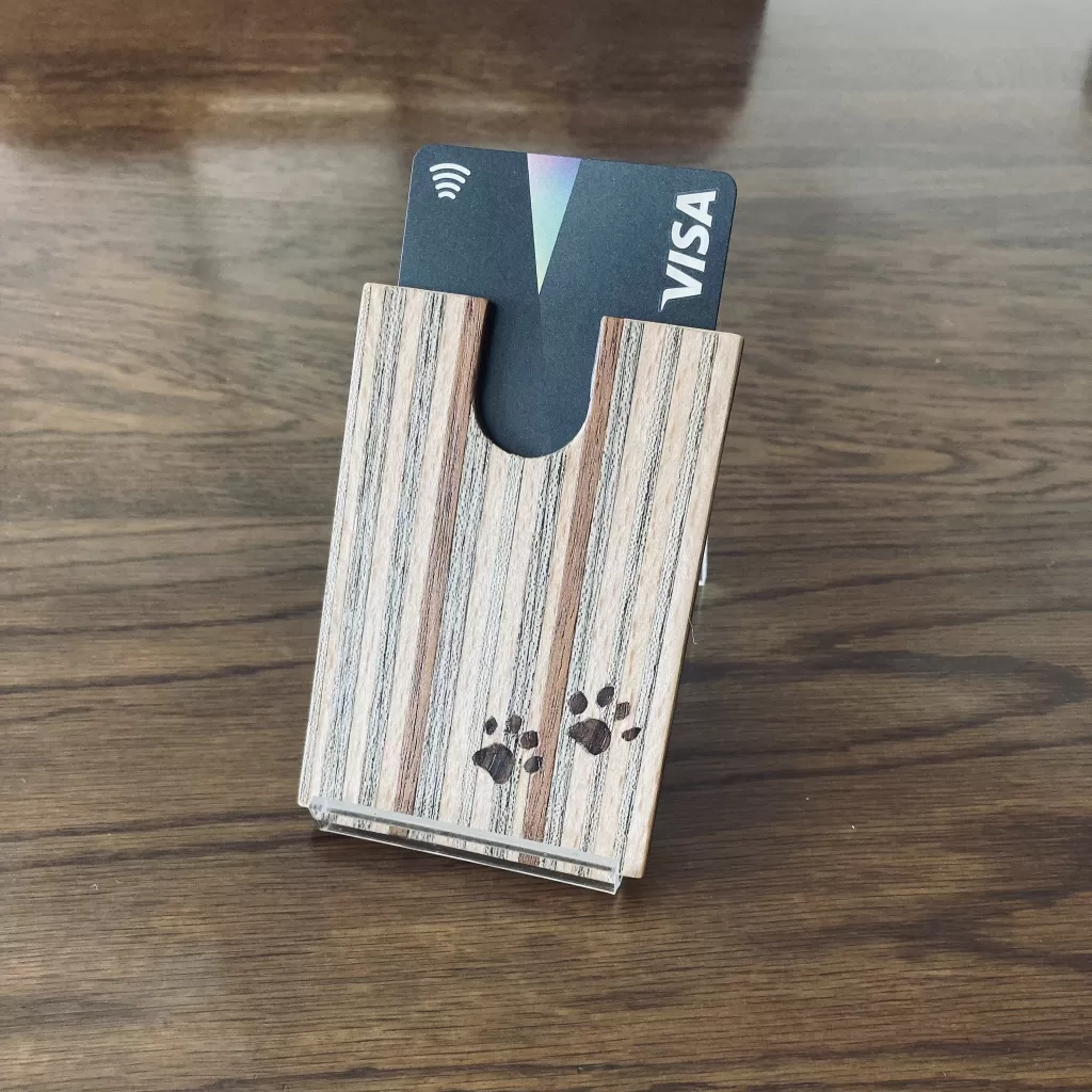 AdoMでは、木製のお財布を準備しました。現金は入りません。クレジットカード・身分証明書・交通系カードを持ち歩くことが出来ます。私個人で使用しているものはマネークリップを付属していますが、御希望に沿った機能を付属することが出来ます。現在のカード類は殆どがICチップ搭載の為、磁気でカードが使えなくなるという心配は極めて少なくなっていますので重ねて持ち歩いても大丈夫です。